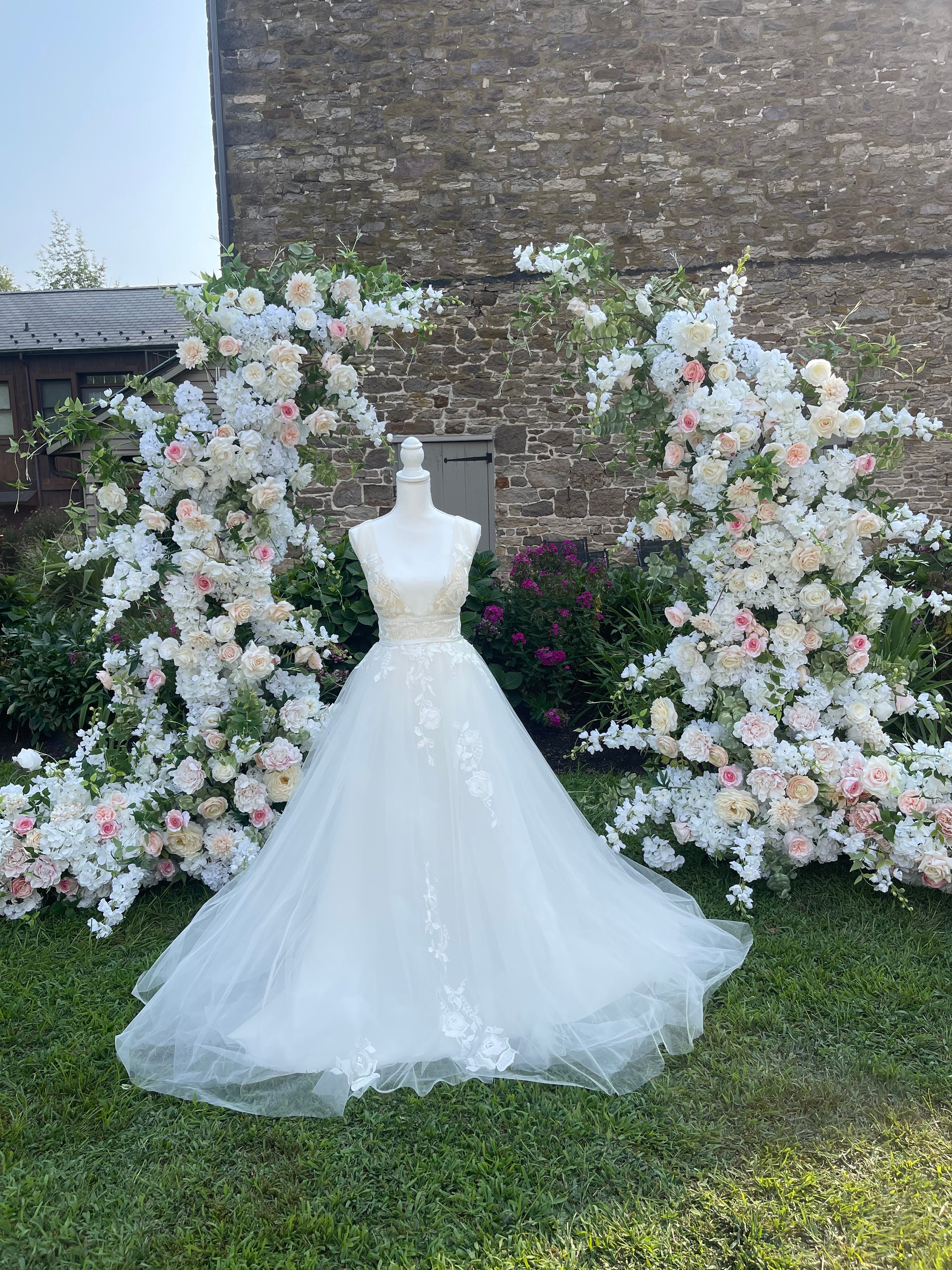 Accentuated by the gentle charm of blush sweet peas, white delphiniums, and touches of eucalyptus, the design embodies an airy, fine art garden style. The carefully curated color palette of blush, ivory, and whites, complemented by pops of mauve, creates a harmonious and enchanting atmosphere. This arch is not just a backdrop; it’s a breathtaking focal point that transforms any setting into a dreamlike landscape.